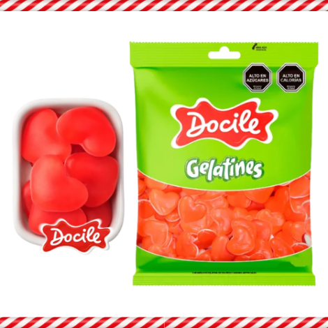 Gomitas importadas Docile con sabor a cereza y forma de corazones, en presentación de 250 gramos.