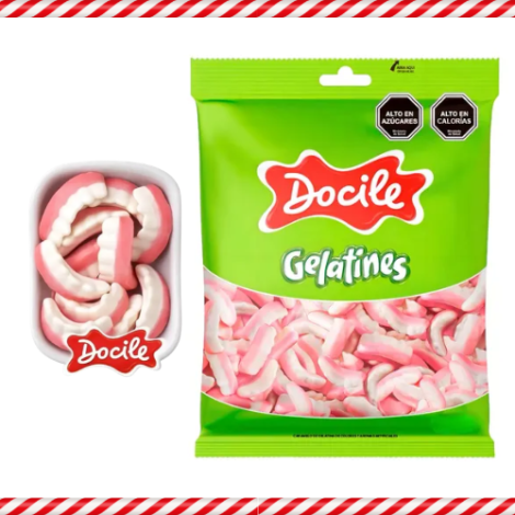 Gomitas importadas marca Docile con forma de dientitos, en presentación de 250 gramos.