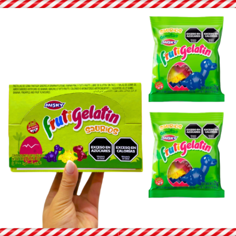 Gomitas Misky de sabores frutales y forma de dinosaurios, en presentación de 12 paquetitos de 25 gramos cada uno.
