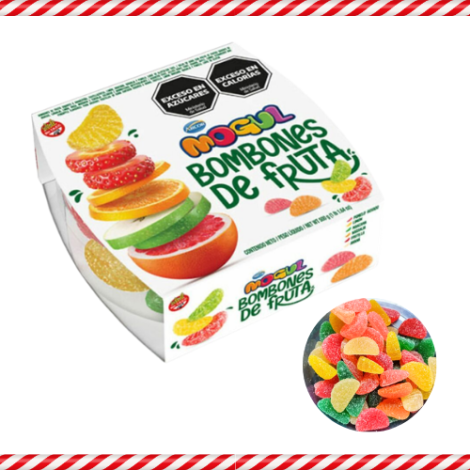 Bombones de fruta Mogul en presentación de 500 gramos, sabores frutales surtidos.