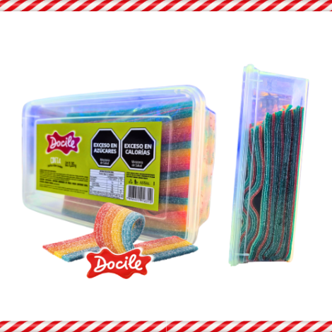 Gomitas Docile Cintas sabor frutilla acidas en tupper de 1,350 gramos.