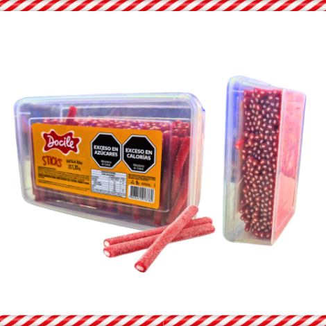 Gomitas Docile Sticks sabor frutilla acida en tupper de 1,350 gramos.