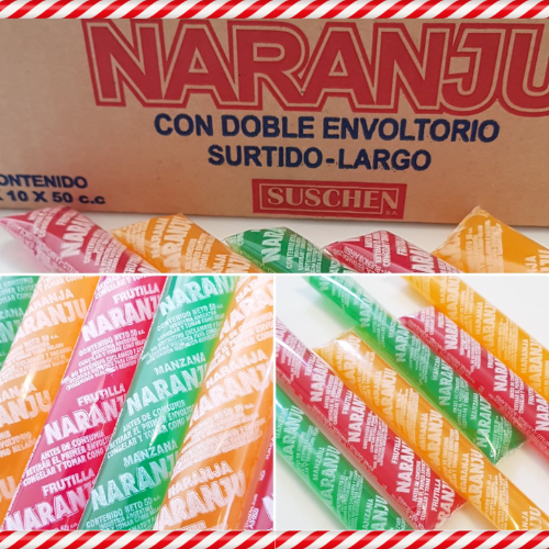 Jugos listos para congelar marca Naranju en caja de 60 unidades de sabores surtidos (20 de manzana. 20 frutilla, 20 de naranja).