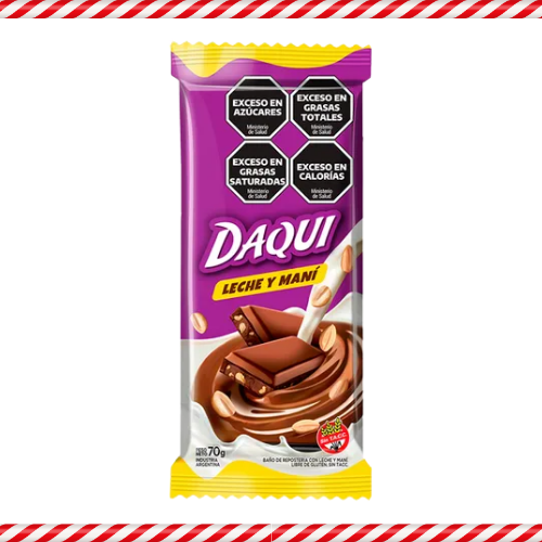 Chocolate con leche y mani picado Daqui en presentación de 70 gramos.