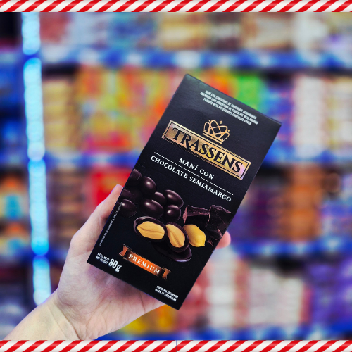Mani cubierto con chocolate semiamargo marca Trassens en paquete de 80 gramos.