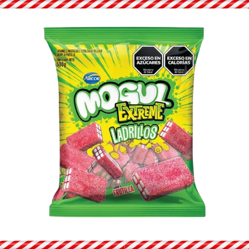 Gomitas Mogul Extreme acidas con forma de ladrillos sabor frutilla en paquete de 500 gramos.