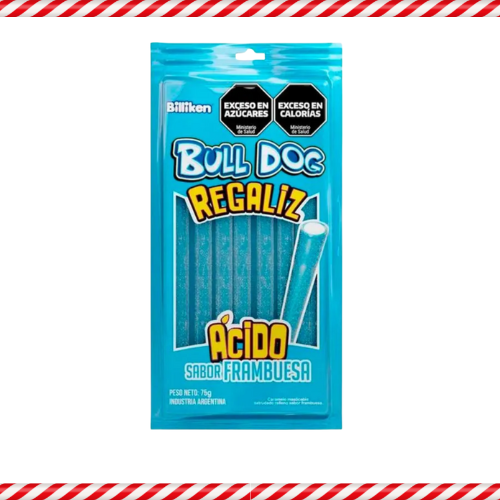 Gomitas Bulldog Regaliz sabor frambuesa acida en paquete de 75 gramos.